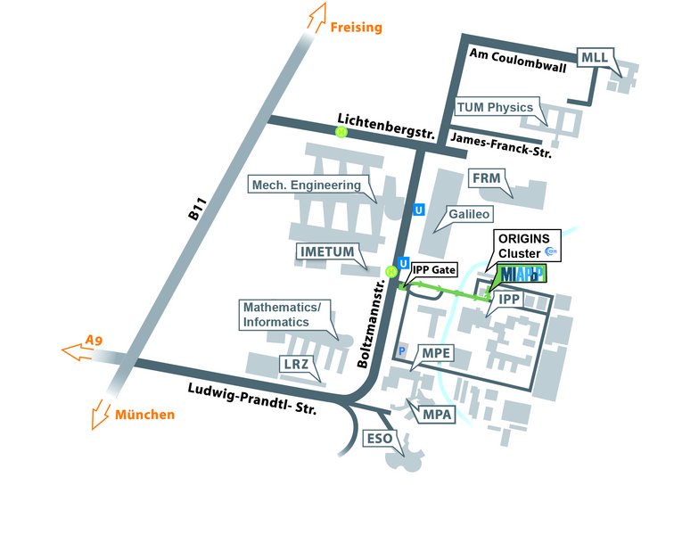 Public transport: Arriving from the airport take S1 and change in "Neufahrn". From there take bus no. 690 to Garching Campus (Garching Forschungszentrum). Exit at the terminal station and walk to the IPP gate (see map). Approch the guard at the gate and ask to be let in. Your name wil be on a list for MIAPbP. From there keep left of the central green, cross the bridge with blue handrails and take a turn to the left. Follow the street until you reach the entrance of the MIAPbP building on the right. You can find a detailed description on how to reach MIAPbP using public transportation here.